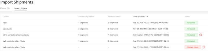 En la barra de navegación, seleccione Envíos y luego Crear nuevo envío. A continuación, seleccione Envíos de importación en la esquina superior derecha. Una vez que haga clic en Envíos de importación, podrá cargar su archivo CSV. Cada fila del archivo representa un envío y debe seguir el formato correcto. Puede descargar una plantilla CSV directamente desde la plataforma para garantizar que la estructura sea correcta.