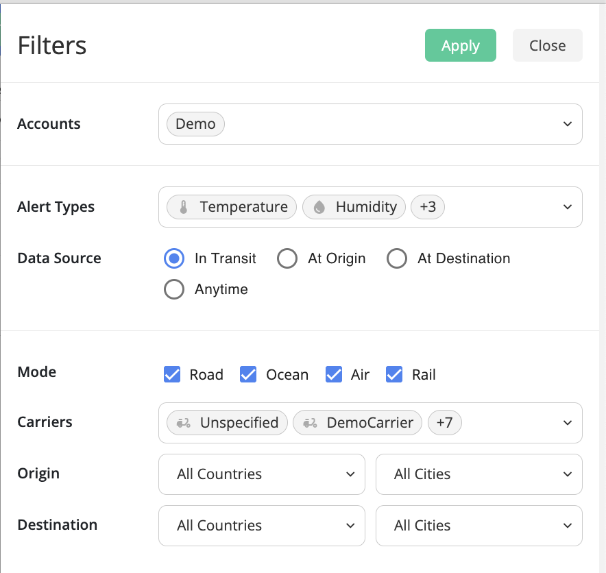 Para envíos sensibles a la temperatura, puede monitorear las fluctuaciones de temperatura en diferentes modos y rutas de transporte. Esto ayuda a identificar áreas problemáticas, optimizar la selección de transportistas y prevenir problemas de cumplimiento o el deterioro del producto.