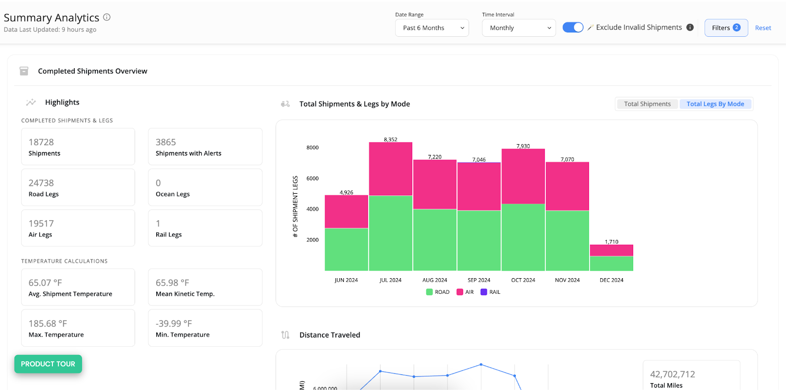 - Seguimiento de métricas clave: Supervise la duración del envío, la temperatura, las alertas y más, para garantizar el cumplimiento y el rendimiento.